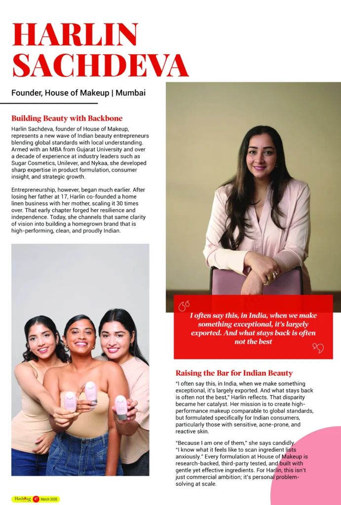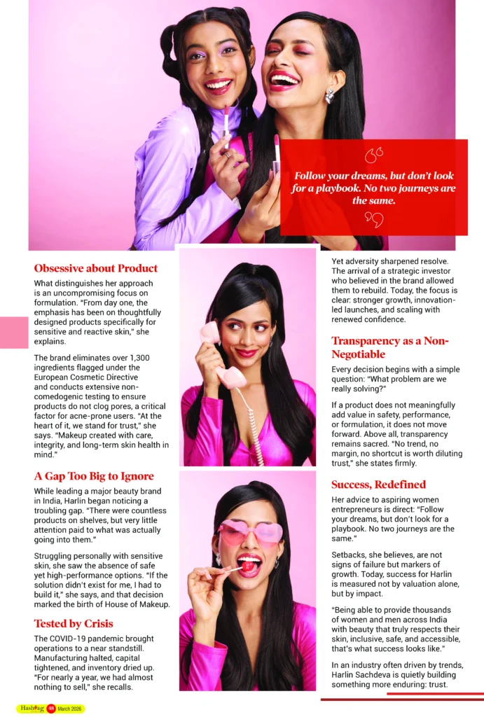 While leading a major beauty brand in India, Harlin began noticing a troubling gap. “There were countless products on shelves, but very little attention paid to what was actually going into them.” Struggling personally with sensitive skin, she saw the absence of safe yet high-performance options. “If the solution didn’t exist for me, I had to build it,” she says, and that decision marked the birth of House of Makeup.
