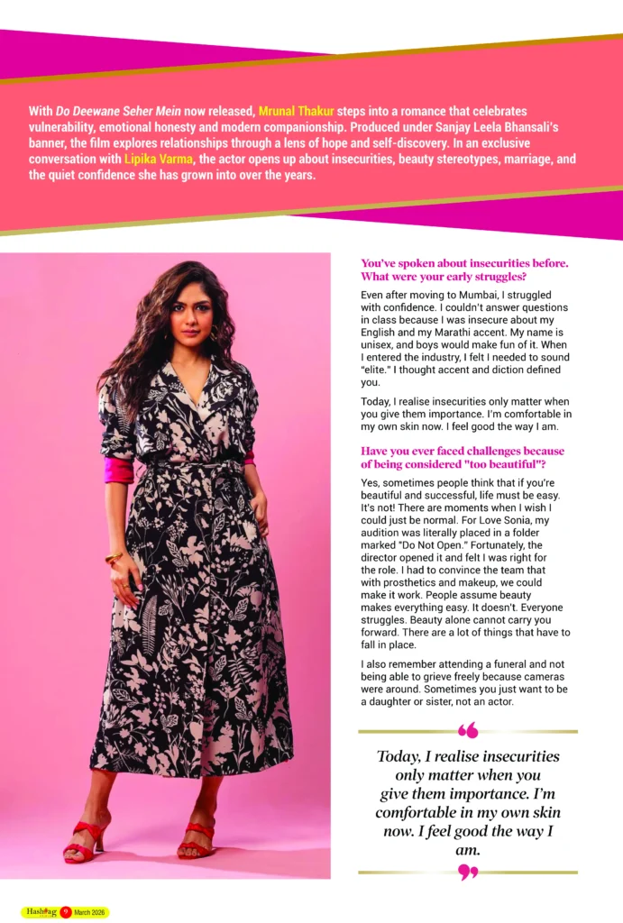With Do Deewane Seher Mein now released, Mrunal Thakur steps into a romance that celebrates vulnerability, emotional honesty and modern companionship. Produced under Sanjay Leela Bhansali’s banner, the film explores relationships through a lens of hope and self-discovery. In an exclusive conversation with Lipika Varma, the actor opens up about insecurities, beauty stereotypes, marriage, and the quiet confidence she has grown into over the years.