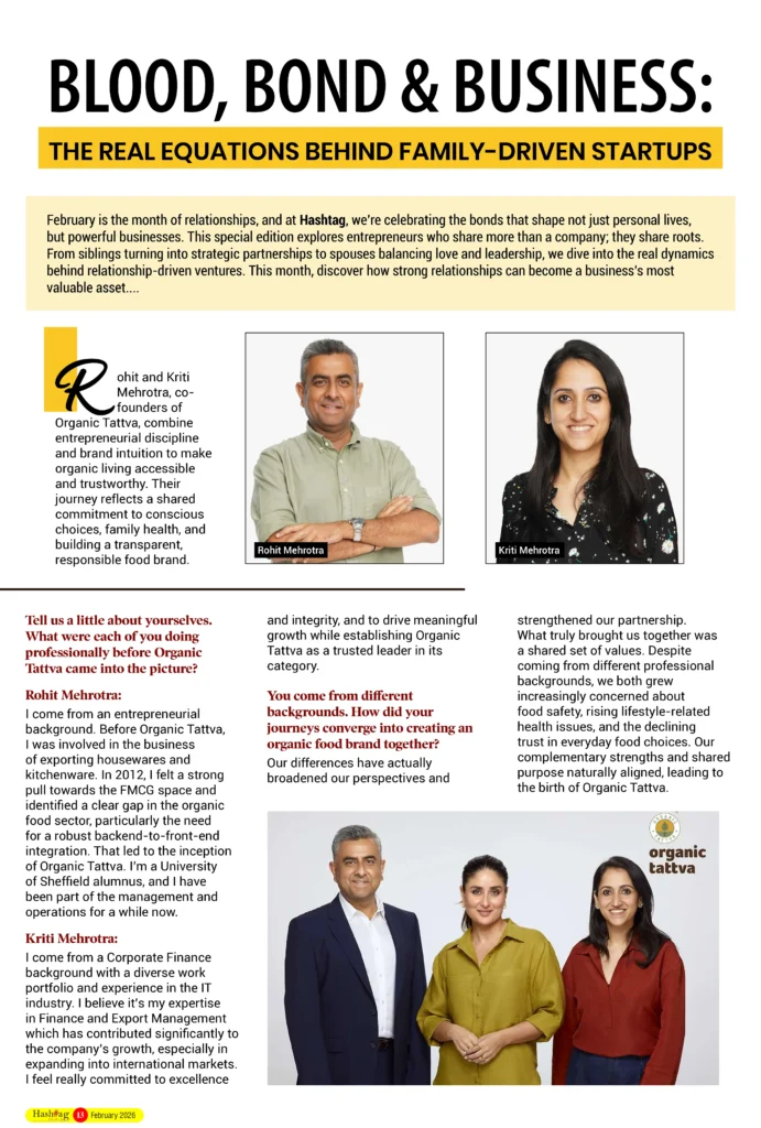 Rohit and Kriti Mehrotra, co-founders of Organic Tattva, combine entrepreneurial discipline and brand intuition to make organic living accessible and trustworthy. Their journey reflects a shared commitment to conscious choices, family health, and building a transparent, responsible food brand.