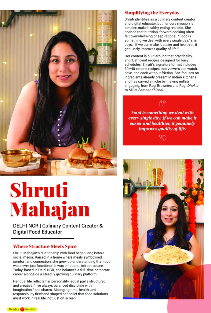 Shruti identifies as a culinary content creator and digital educator, but her core mission is simpler: make healthy eating realistic. She noticed that nutrition-forward cooking often felt overwhelming or aspirational. “Food is something we deal with every single day,” she says. “If we can make it easier and healthier, it genuinely improves quality of life.”