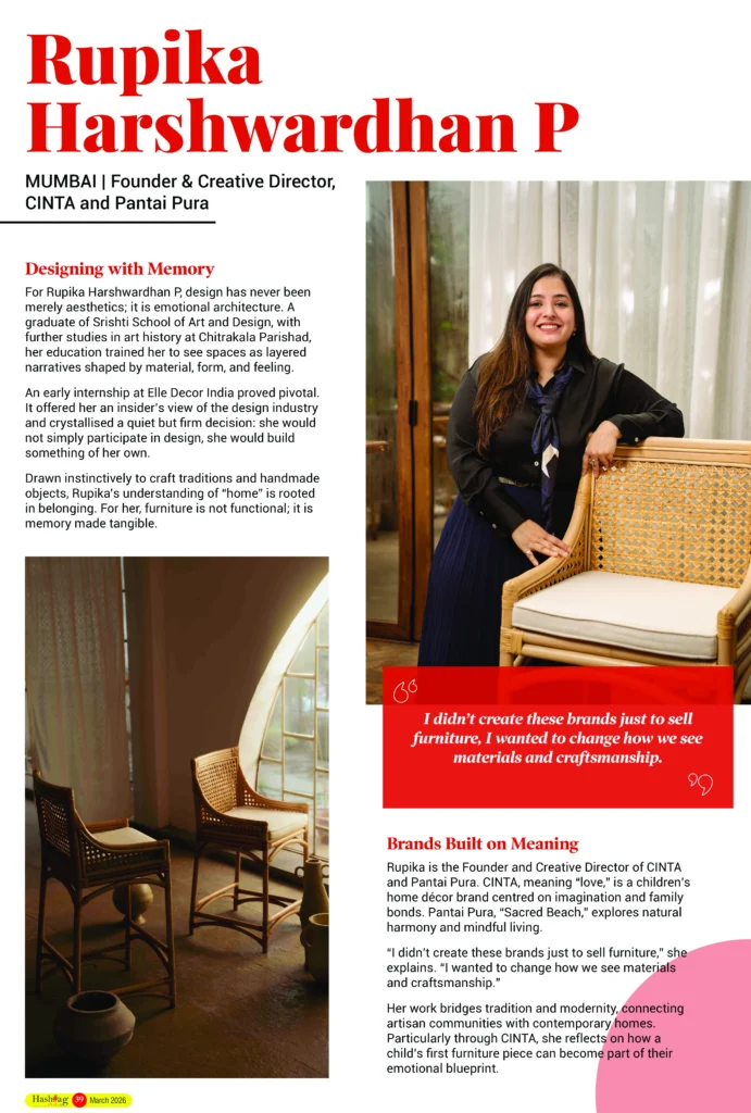 For Rupika Harshwardhan P, design has never been merely aesthetics; it is emotional architecture. A graduate of Srishti School of Art and Design, with further studies in art history at Chitrakala Parishad, her education trained her to see spaces as layered narratives shaped by material, form, and feeling.